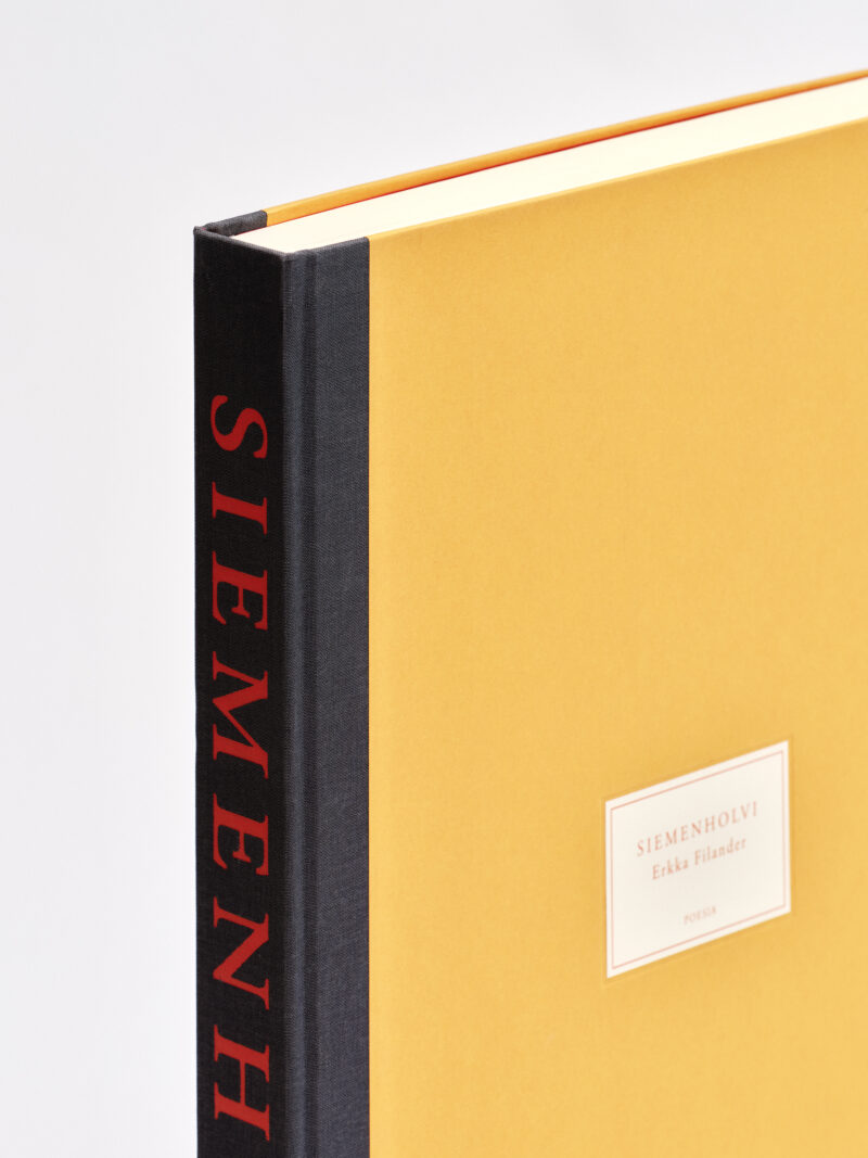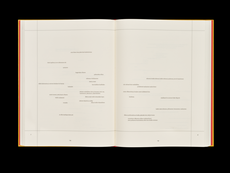 Kirjan mittakaava mukailee klassista koodeksia ja kantaa mukanaan kirjasuunnittelun kerrostumia. Sen hienovaraiset materiaaliset viitteet johdattavat ajatukset renessanssiin — punainen antiikva tuhkan-mustalla kangaskluutilla, ruhtinaallinen kullankeltainen kansiyliveto italialaisella paperilla. Paksu paperi hellii sormia, sivuille pudoteltu typografia on inhimillisen kaunista.